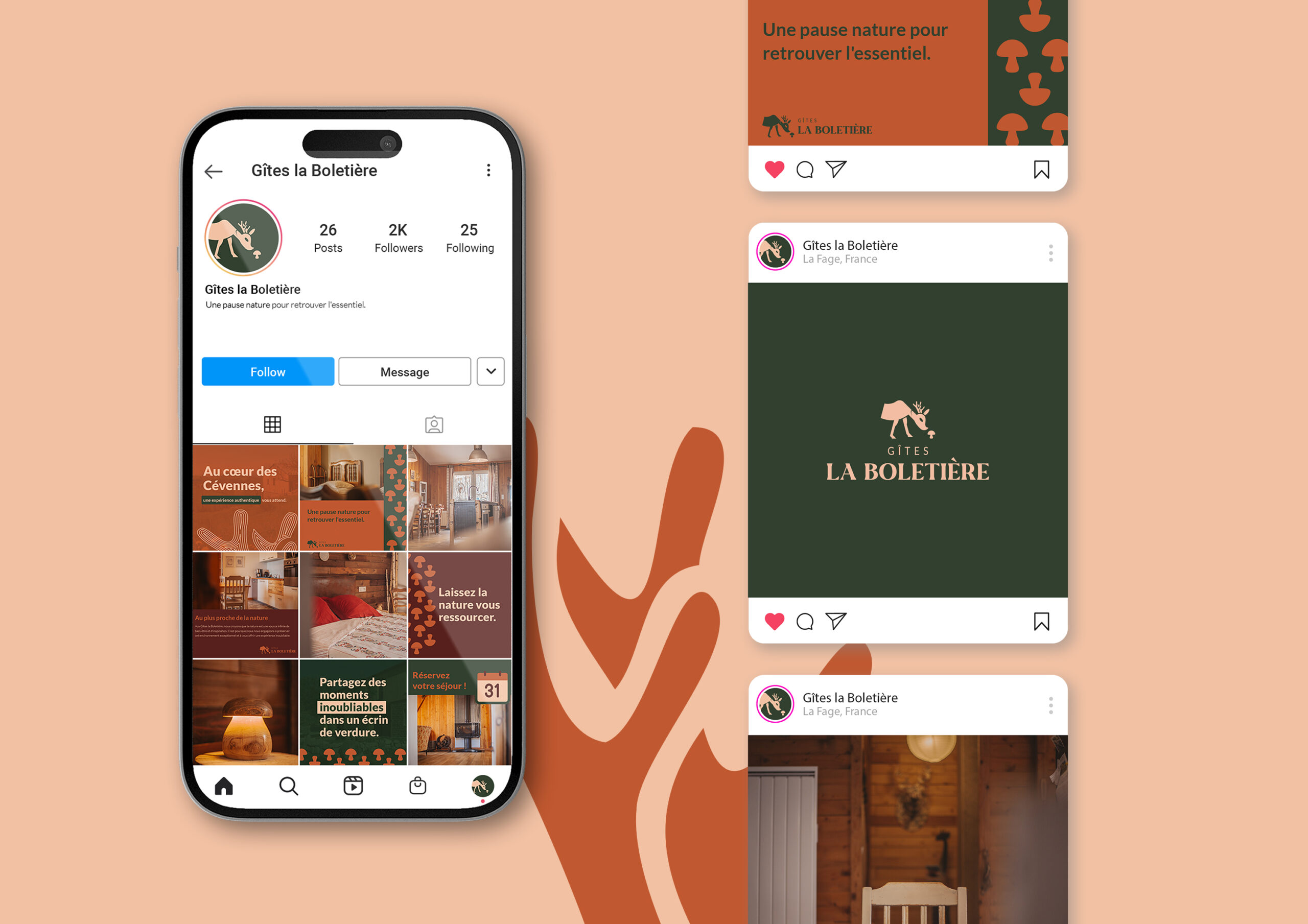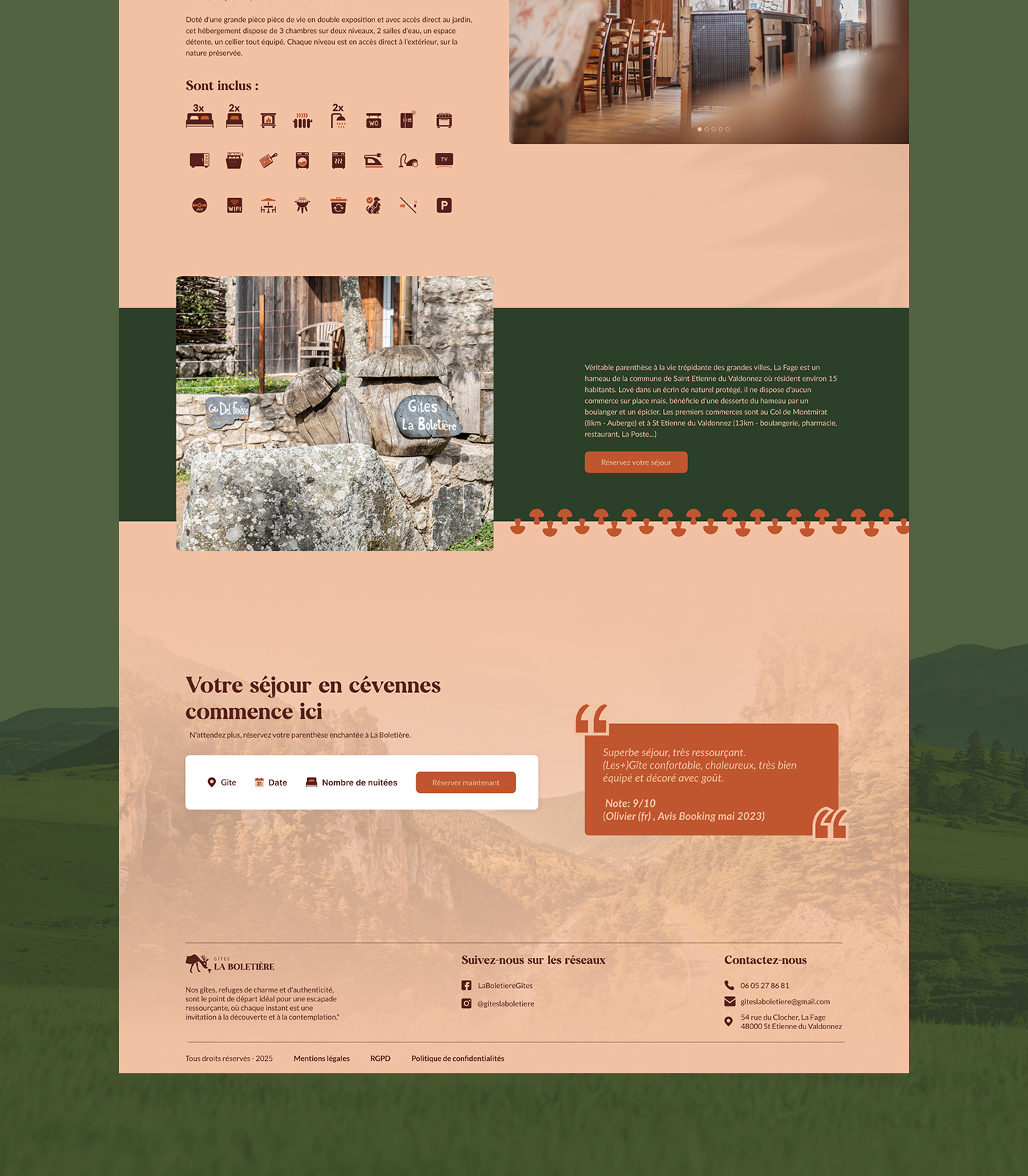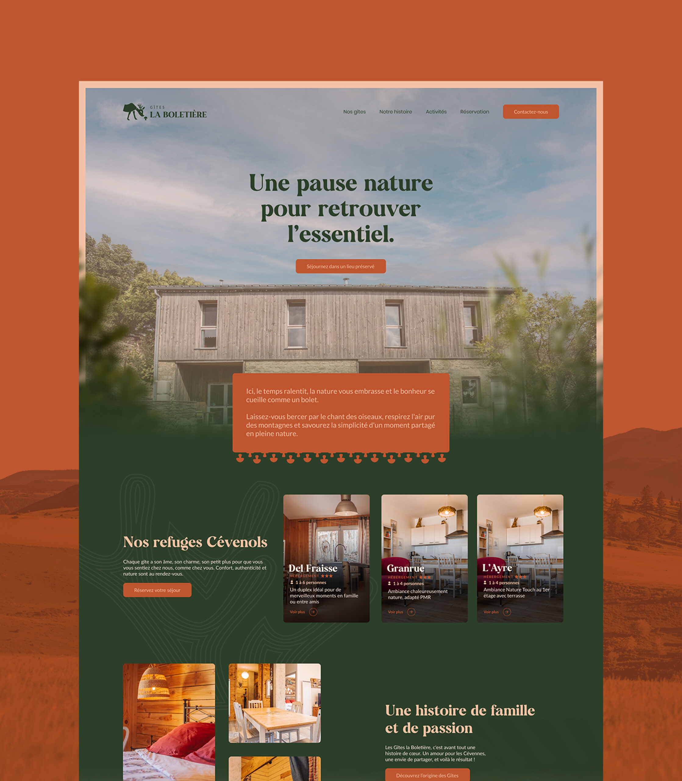 Nous avons ensuite accompagné Gîtes la Boletière dans la création de leur logo, de leur univers graphique, illustration et pictogrammes, la création de mises en pages éditables pour les réseaux sociaux et documents, la réalisation des photographies de leurs établissements, et la création du site internet avec module de réservation.